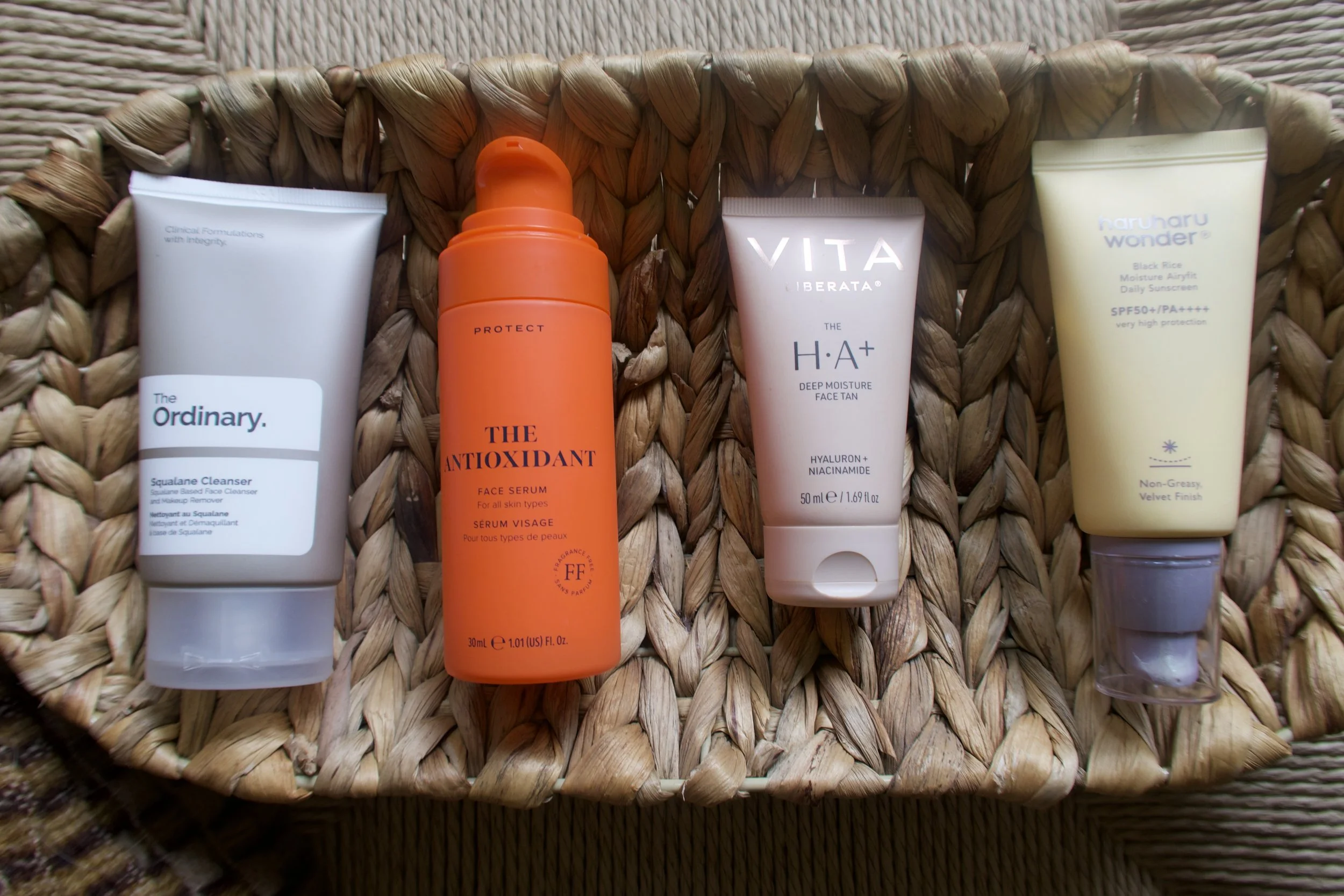 You’ll see that I’ve slipped my little face tanner into this line-up - I talk about that later! Products shown are: The Ordinary Squalane Cleanser, online here; Skin Rocks The Antioxidant, here; Vita Liberata Face Tan, here, and Haruharu Wonder SPF50 which is online here.