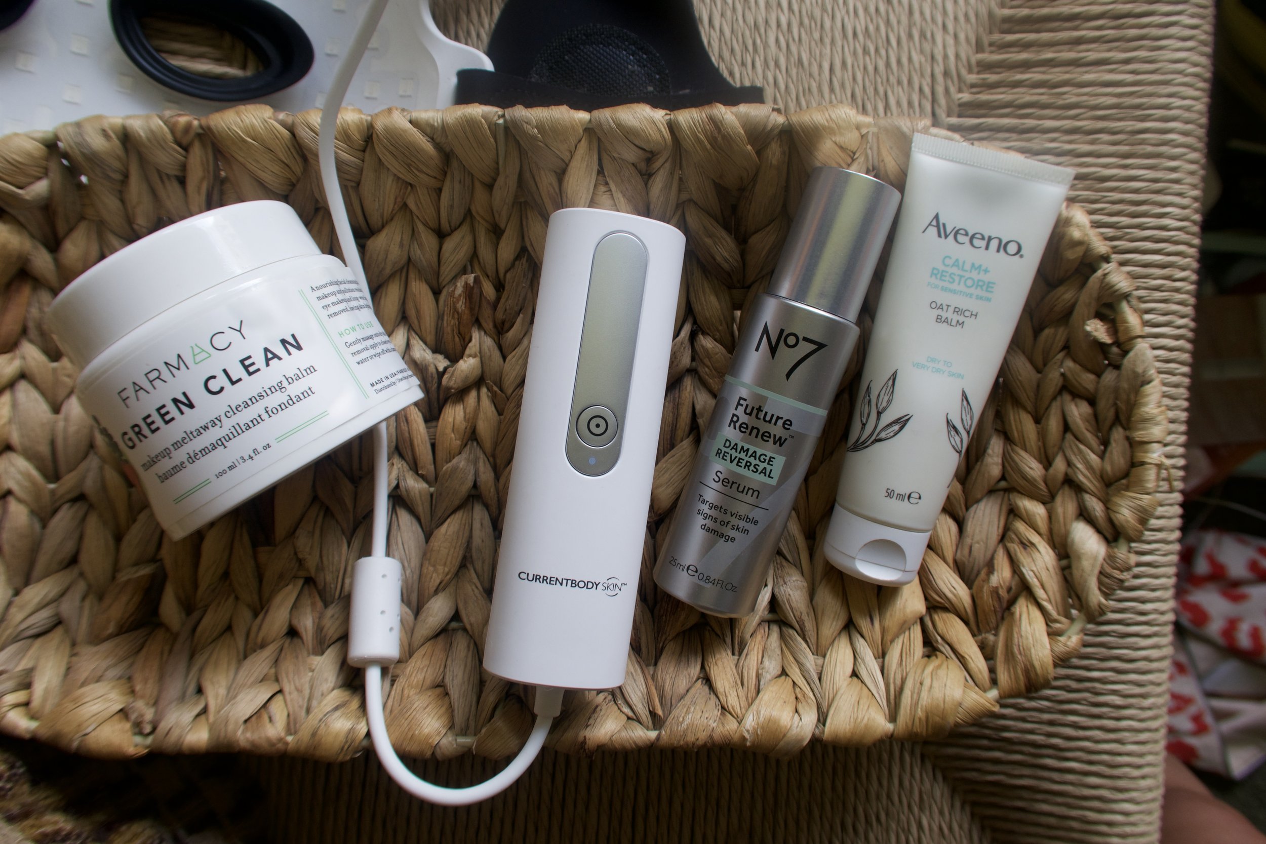 Products shown: cleansing balm as before, No7 Future Renew Night Serum here, Aveeno Oat Rich Balm, here.